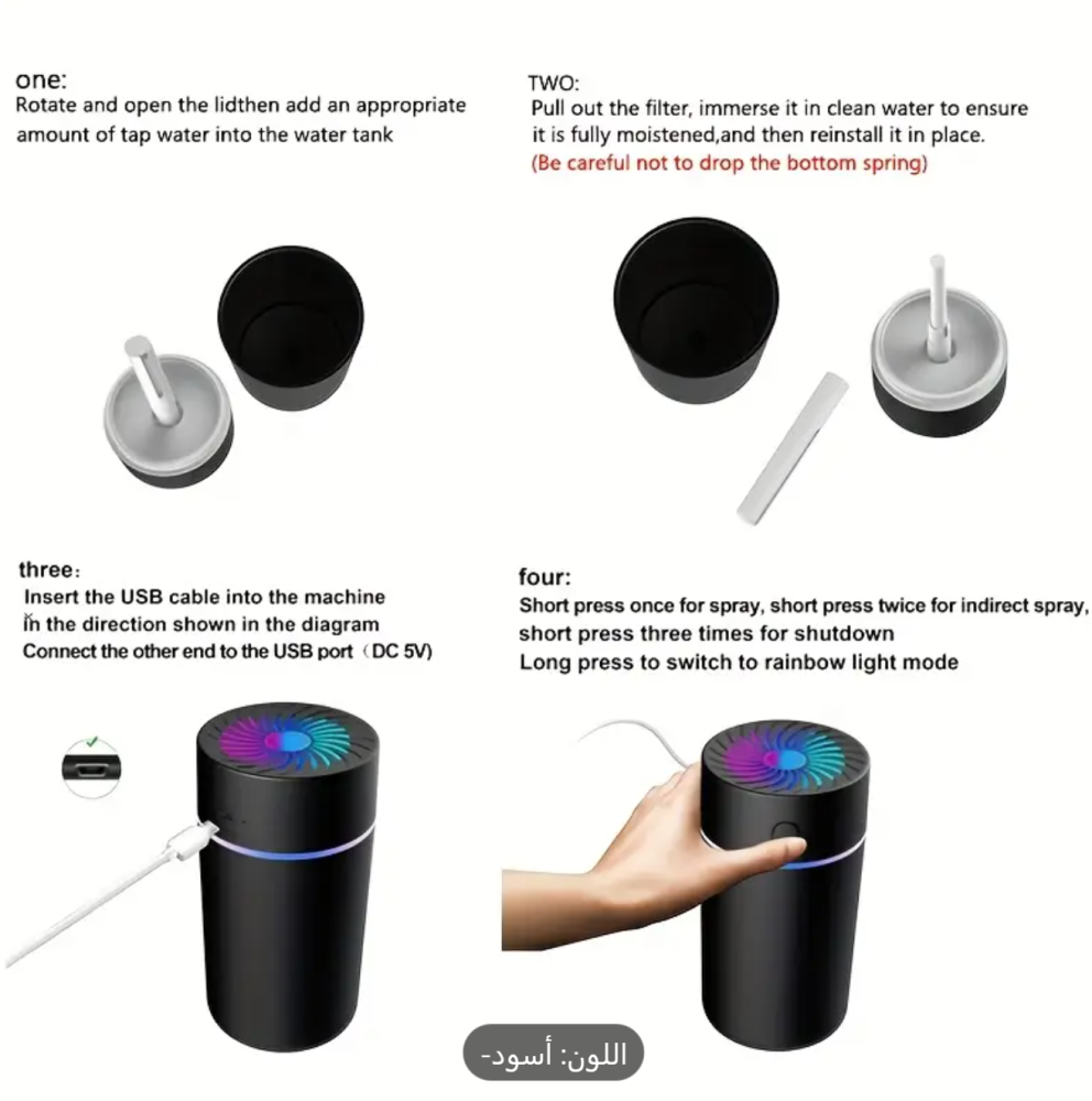 جهاز تعطير السيارة USB الذكي باللون الأسود الأنيق، يضفي لمسة عصرية وجمالية على داخل سيارتك بفضل إضاءة RGB المميزة والمتغيرة الألوان. يعمل الجهاز عن طريق منفذ USB، ويُعبأ بالماء والعطر المفضل لديك ليطلق رذاذاً ناعماً يملأ سيارتك برائحة منعشة وجذابة. استمتع بأجواء مريحة ومعطرة أثناء قيادتك مع هذا الجهاز العملي والأنيق.